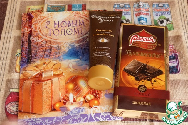 Красивая открытка, классный крем для рук и шоколадка - мужу ))