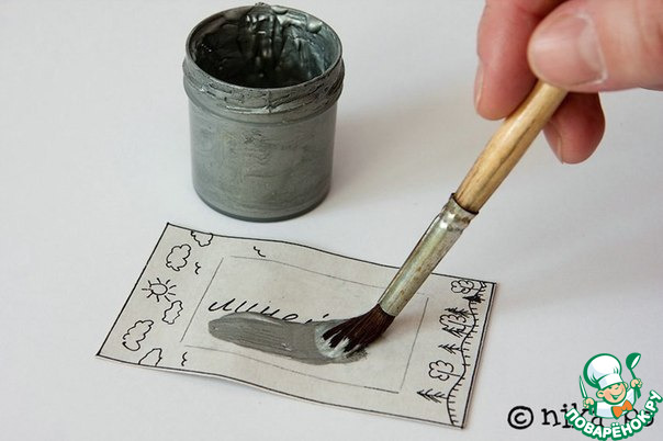 4. Когда мыло подсохнет, можно закрашивать прямоугольник гуашью. Чтобы имитировать металлическое покрытие, которое обычно делают на таких билетиках, используем серебристую гуашь. Теперь нужно лишь дождаться полного высыхания краски!
