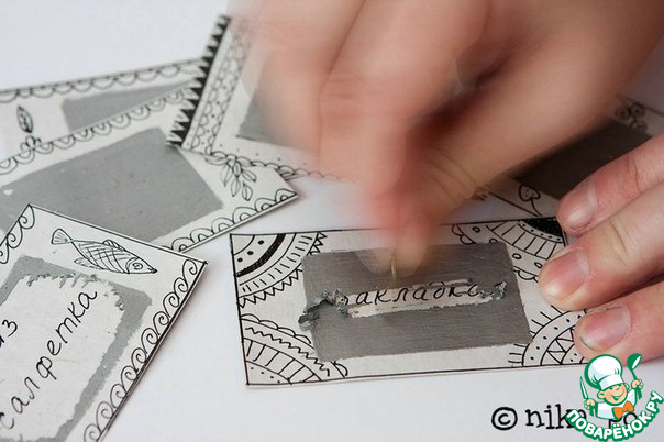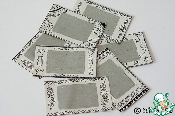 1. Нарезаем белый (не глянцевый) картон на небольшие билетики, примерно 8 на 5 см. Делаем из картона шаблон для серединки – примерно 5 на 3 см. Рисуем по шаблону прямоугольник в центре билетиков.