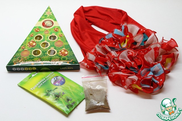ароматические нежно пахнущие масла в подарочной упаковке, красивый шарф-жабо, и наконец из недр коробки было отрыто то, что так будоражило и опьяняло моих котиков - травяная смесь для когтеточки.