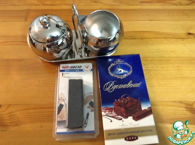 Чудесный наборчик из красивого металла - молочник-соусник и сахарница (пусть меня Ирочка поправит, если я напутала). Как раз к новогоднему столу. А этот маленький брусочек- антинагар . Я такой впервые встречаю. Он снимает нагар с посуды, просто чудо какое-то. Опробую после отчета. Шоколад,вернувший меня в детство, я такой очень любила в прошлой жизни.