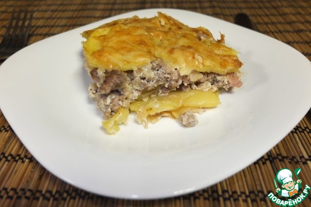 В картофельную «лазанью» я добавила мясной фарш и кусочки бекона. Вышло отлично!!! Нежная начинка под хрустящей корочкой! Муж просил добавки! https://www.povarenok.ru/recipes/show/100040/
