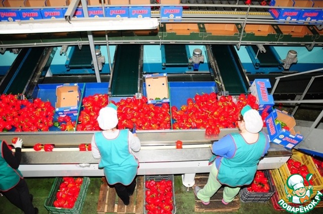 Завели на склад, а там.... ПОМИДОРЫ. ТОННЫ ПОМИДОР. Короче, работа заключается в том, что помидоры, собранные в теплицах, нужно помыть в огромной специальной машине, уложить в ящики, отправить на конвейер, где стоят эти несчастные женщины и разбирают, вытирают от грязи каждую помидорку и расфасовывают по коробочкам. Затем коробки с томатами запечатываются в пластик и укладываются в картонные ящики и отправляются заказчику на продажу!