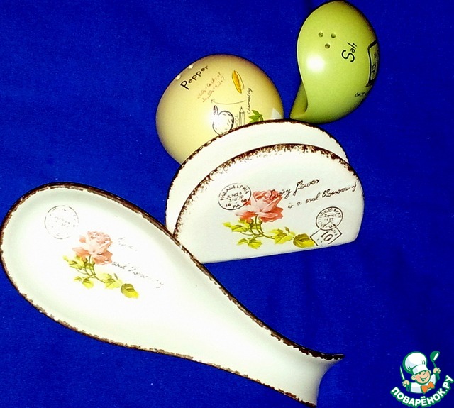 В мою коллекцию добавилась ложка и подставочка для салфеток из этого комплекта мне тоже очень понравилась... Этот комплект напоминает, что - то антикварное. А я очень люблю антикварные вещицы.