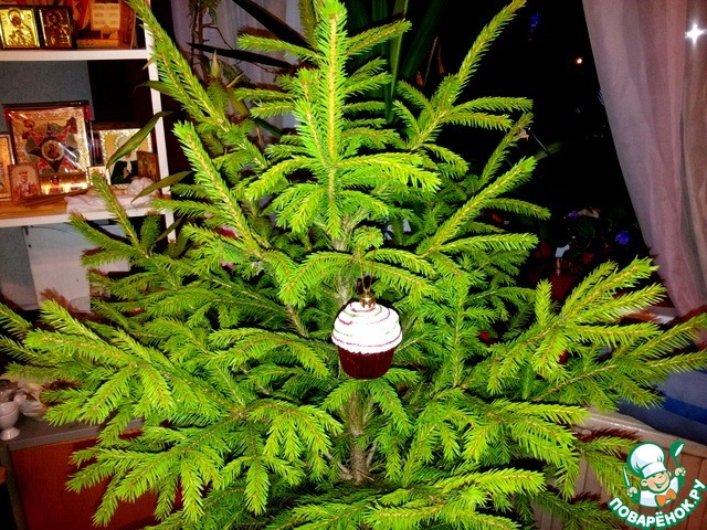 Последняя штучка из подарка от Деда Мороза, Новогодний кекс. Эта игрушечка первая заняла место на нашей живой ёлочке из леса. Ёлочка у нас гостит уже две недели. После Нового года она перекочует на улицу под окно.