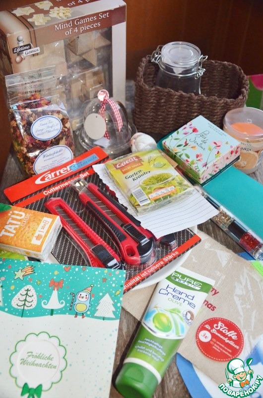 В заботливо собранной посылке, Анечка не забыла никого из моей семьи, написала инструкцию на русском языке к каждому подарку, проложила посылку бумажными салфетками, чтобы ничего не разбилось. Вот общий вид.