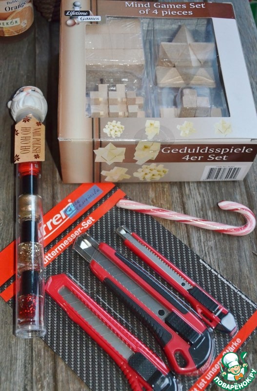 Набор ножей для мужа (как только не побоялась отправлять их!!! ведь это запрещено), набор лаков для ногтей в Новогодней упаковке для старшей дочери и набор логических деревянных игр - для младших. Конфетки - палочки тоже для младших, правда до фотосессии дожила одна.