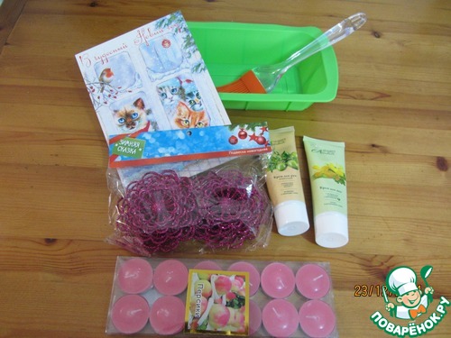 Чудесная силиконовая формочка для кексов салатового цвета, кисточка тоже силиконовая., крема для рук и для ног, очень ароматные и нужные зимой, когда особенно кожа нуждается в уходе.Красивая открытка с душевными пожеланиями и моими горячо любимыми кошечками, даже это Алиночка учла.