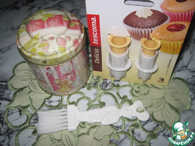 Баночка для заварки, ажурная салфетка, кисточка для выпечки и шприц для наполнения кексов.