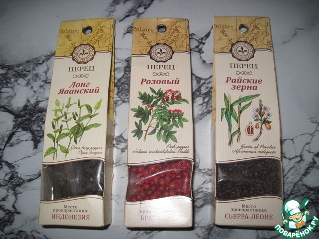 Перцы: розовый, лонг яванский, райские зерна. О последних двух я слыхом не слыхивала. Будем пробовать.