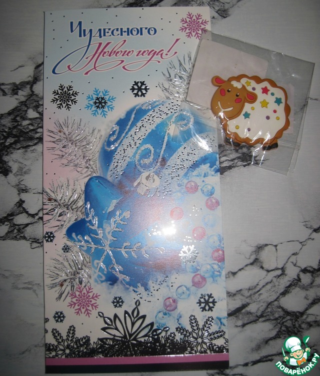 Магнитик (уже на своем месте, на холодильнике) и открытка с пожеланиями, которые обязательно сбудутся в следующем году.