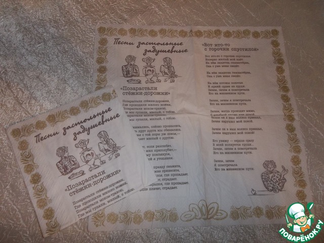 А таких салфеток я ни когда не видела. На ней песни застольные напечатаны!!!!!