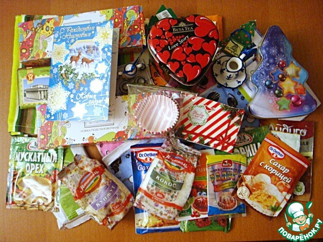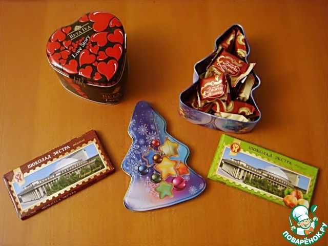 Чай в музыкальной шкатулке с сердечками,которая проигрывает музыку к песне "История любви": "Как,с чего начать..." - просто чудо!Очень вкусные шоколадки и мои любимые конфеты "Птичье молоко" Новосибирской фабрики в красивой,новогодней коробочке в виде елки.