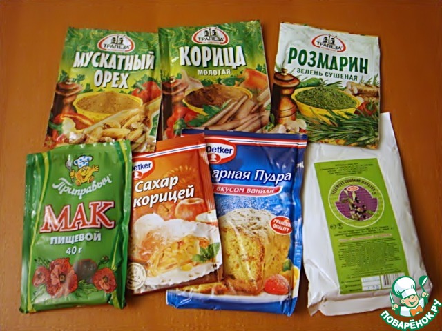Целая россыпь специй и приправ - это такое богатство: мускатный орех,корица,розмарин,мак,сахар с корицей,сахарная пудра со вкусом моей любимой ванили,молотая черемуха,
