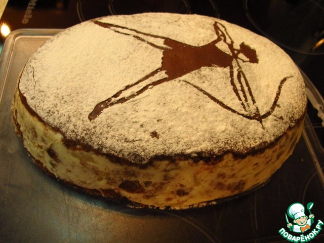 Покрыла сверху растопленным шоколадом (сверху у меня ровненький корж, а не начинка!), дождалась полного застывания. В холодильнике. Чтобы наверняка. Затем положила сверху заранее вырезанную из обычной бумаги фигурку (любая тема - интернет вам в помощь!)))) У меня Стрелец, потому как отмечался день рождения коллеги - Стрельца по знаку зодиака), и с помощью сита посыпала сверху сахарной пудрой. Затем аккуратненько сняла трафарет и ножиком поправила чуть посыпавшиеся углы рисунка.