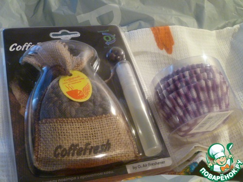 И напоследок. Бумажные формочки для кексов и освежитель воздуха... Он не простой. Это мешочек с зернами кофе, к которым идет ароматизатор с запахом натурального кофе... Какой запах... Запах свежесваренного кофе... Муж балдеет...