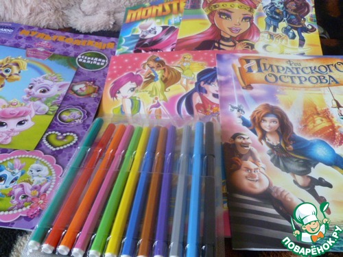 Сразу же я ей подарила от тети раскраски и фломастеры... Она сразу побежала разукрашивать...