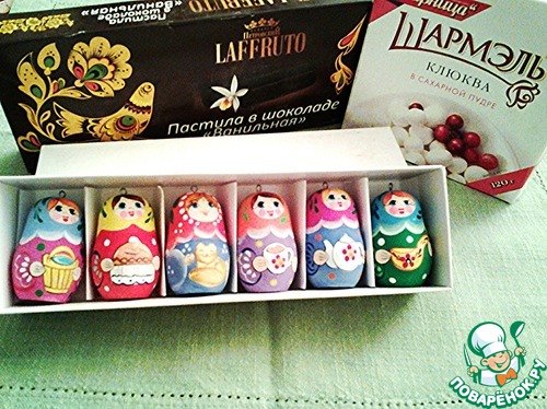 Изумительные матрешечки на елку (никогда прелести такой не видела), вкуснейшая пастила в шоколаде и любимое лакомство моей дочки - клюква в сахаре.