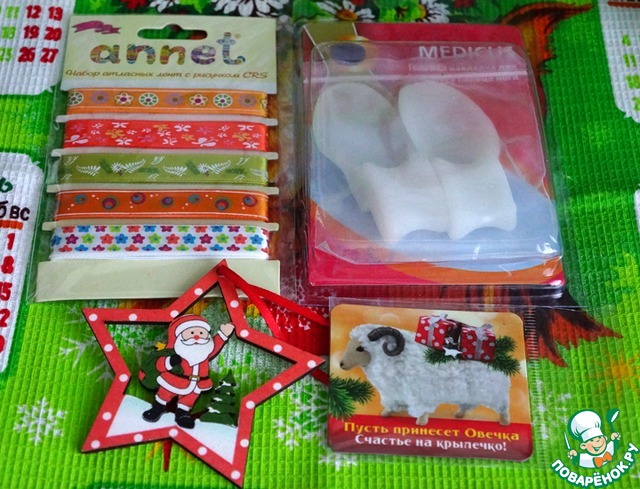 Целый набор красивых ленточек, (Наташа как знала, буквально на днях стала присматриваться к таким ленточкам, пока купила себе только в горошек, а тут столько красоты), замечательная деревянная звездочка-подвеска с милым Дедушкой морозом, красивый календарик и накладочки силиконовые для пальцев ног( Наташа и о красоте моей позаботилась