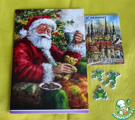 От Нинули (Nika) добрейший Санта, красивый магнитик с видом Таллина и забавные лягушата, наклеечки на телефон(если я правильно поняла)