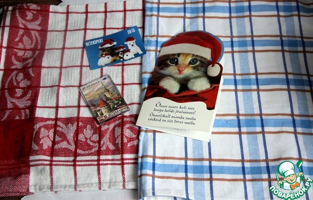 Замечательные льняные полотенца, магнитик Таллинн, НГ календарь с собачками, наклейки-лягушечки упрыгали уже к Насте... и красивейшая открытка в мою коллекцЫю на новом иностранном языке!