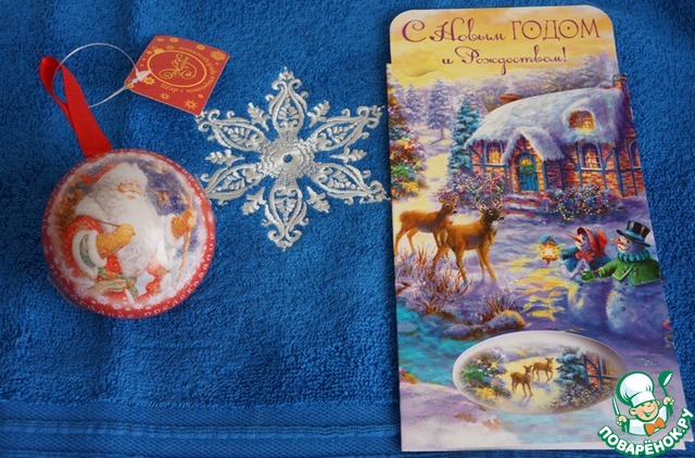 Замечательный, красивый полотенчик, милая открытка с чудесными пожеланиями и Новогодний волшебный шар с чудеснейшим предсказанием внутри, я как его прочла, так что то во мне аж перевернулось, так хочется что бы оно сбылось