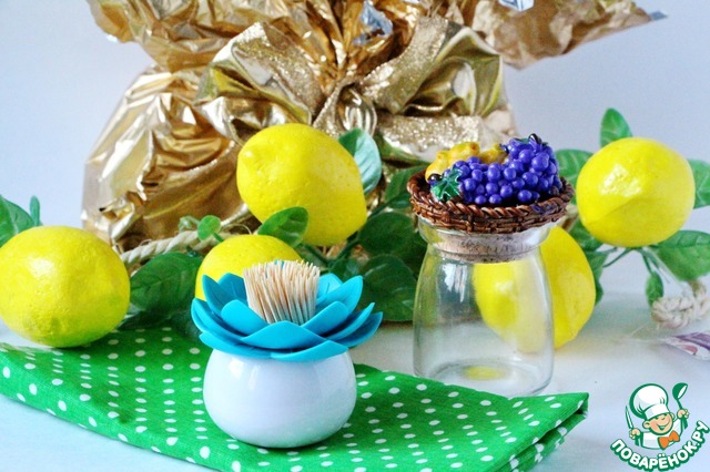 Ольга Демурия собрала подарки для фуд-фото, красивый материал в горошек для фона, гирлянду с лимонами, стеклянную баночку со сказочно фруктовой крышкой и баночку с зубочистками, выполненную в стиле цветка Дюймовочки, для оформления стола.