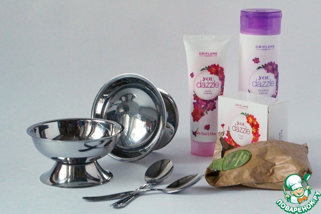 Ирина Ирушенька подарила мне блестящие великолепные креманки с ложечками, о которых я давно тайно мечтала и набор кремов и мыла для ухода с нежнейшим запахом, а мама Иришки прислала ароматнейший вкусный чаек.