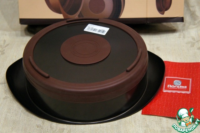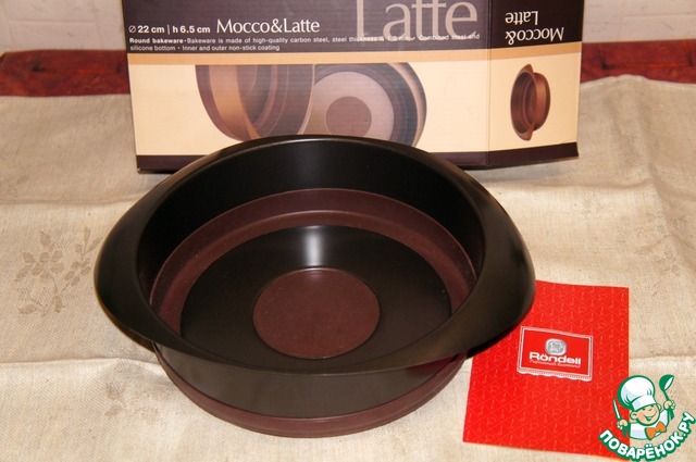 Вид снизу. Чтобы вынуть торт, надо форму перевернуть и просто нажать с двух сторон на кольцевую металлическую вставку, силиконовая вставка по краю дна сложится и пирог без труда выскочит из формы. Форма создана как часть единой коллекции Mocco&Latte фирмой Rondell (вместо "о" должно стоять "О умляут" - О с двумя точками над буквой, как у нашей ё, но такой буквы на клавиатуре нет). Эта серия одобрена и рекомендована к использованию Национальной гильдией шеф-поваров.