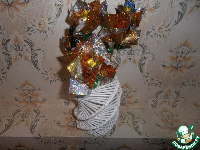 А ещё можно её покрыть лаком и украсить букетиком из конфет.