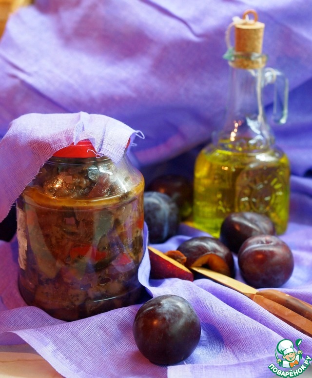 4. Баклажаны со сливами https://www.povarenok.ru/recipes/show/94688/ от Оксаночки (para_gn0m0v). Оригинальный рецепт, с не менее оригинальным результатом. Делала поздней осенью, но вот только собралась с отчетом...Слива у меня была сладковатая, и вот она и придала сладковатую "изюминку"(вернее "сливинку"