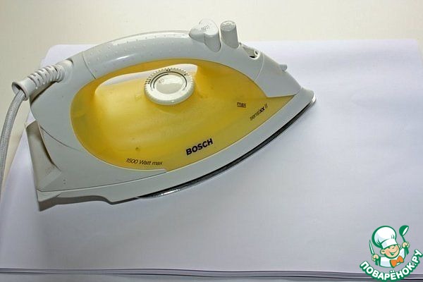 4. Весь этот пирог накрываем простой тонкой бумажкой и проглаживаем утюгом. Проглаживаем при средней температуре, чтобы избежать сгорания бумаги или пленки (не забудьте отключить отпариватель на утюге!).