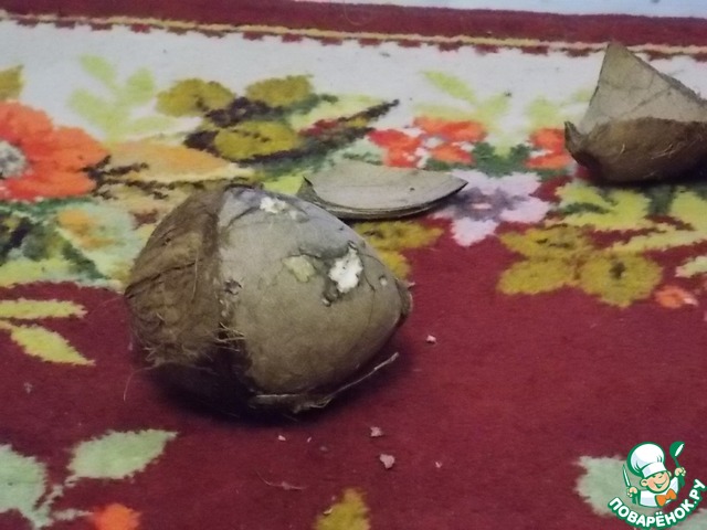 Скажу честно,я пытался добраться до того что внутри при помощи зубов.Но это не кедровый орешек,хотя кедровый вкуснее если честно.Короче мучился я мучился и решил уже плюнуть на это все,как он упал и раскололся.