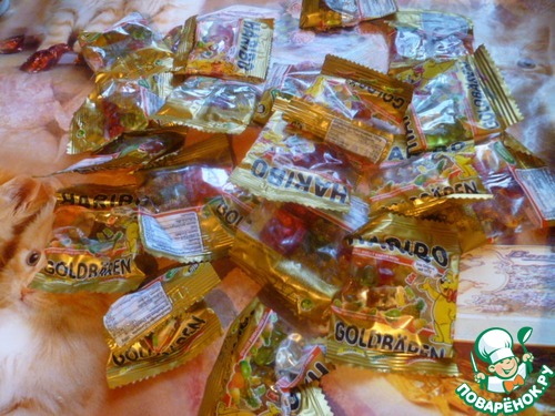 Внутри кучка желейных конфет... И много записочек с объяснениями и разъяснениями всего, и с рецептами....