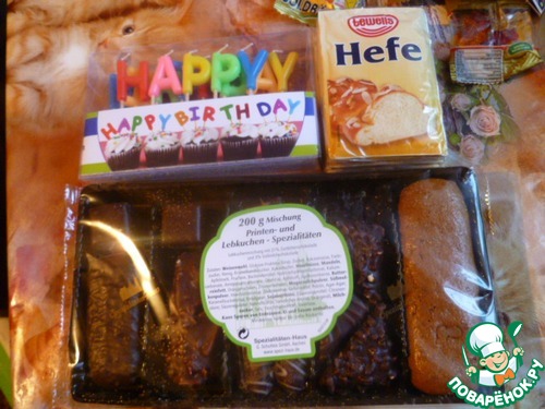 Конфеты, свечи на торт и упаковка сухие дрожжи..