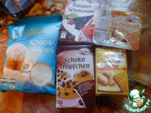 Кокосовая стружка, апельсиновые цукаты, упаковка ванильных сахарков, шоколадные капли и шоколадные кусочки...