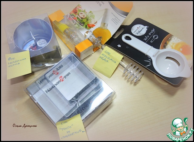 Это для меня: разбрызгиватель для цитрусовых, ложечка для меда и металлические формы, квадратные и круглая, с меняющимся диаметром! О квадратных я давно мечтала, очень их хотела и вот...они у меня теперь есть!!!!