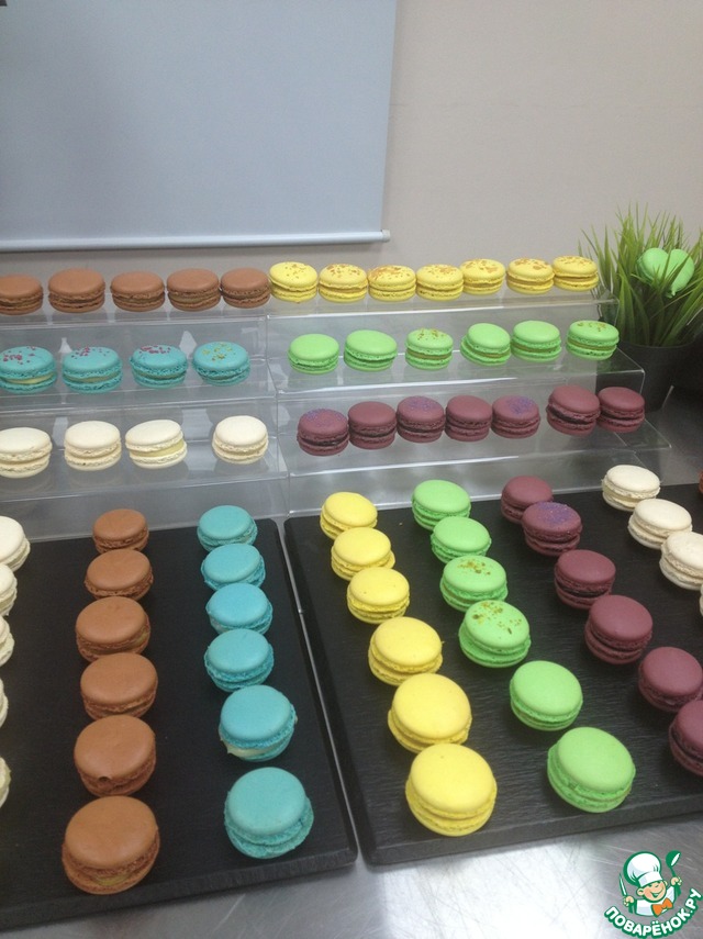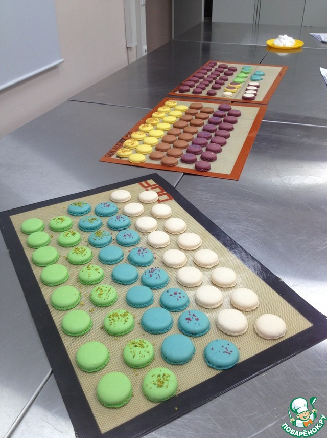 Базовую меренгу одинаковую для всех готовили, а потом добавляли сухие красители и ингредиенты соответственно вкусам-кокос, цедра лайма, кофе и т.д.
