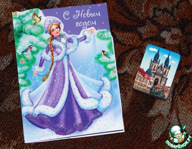 Открыточка с теплыми пожеланиями, в которой был вложен милый путеводитель по подарочкам, и магнитик из Праги (уже на почетном месте на моей доске магнитов