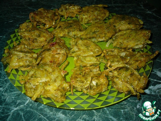 "Луковые оладьи (Bhaji)" по рецепту FoodStation1 https://www.povarenok.ru/recipes/show/96394/ -готовятся просто и быстро,понравилось сочетание специй и лука-получились очень вкусные!