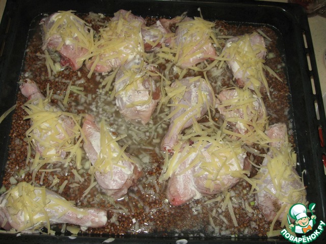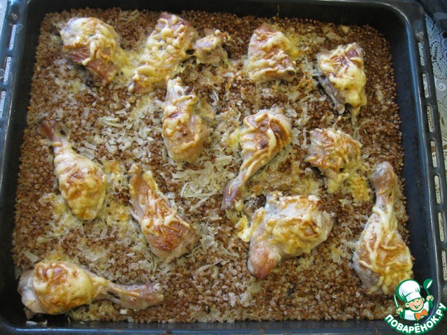 Промытую крупу укладываем на смазанный маслом противень. Сверху посыпаем мелко нарезанным луком и потертым на мелкой терке чесноком. Сверху укладываем курицу, немного ее посолив и поперчив. Курицу смазать сметаной. В противень влить 4 стакана горячей соленой воды. Курицу посыпать натертым на терке сыром и поставить все в духовку, нагретую до 180 градусов примерно на час.