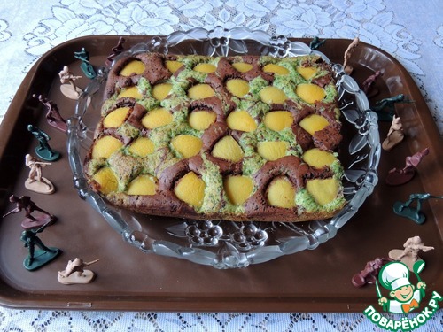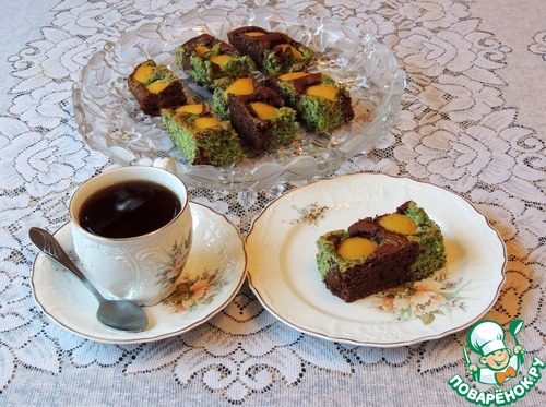 Вкусный нарядный пирог. Делала с добавлением 2 шариков размороженного шпината в белую часть теста (для камуфляжного эффекта), абрикосы с успехом заменили разрезанные на четвертинки персики. Форма 22х30 см.