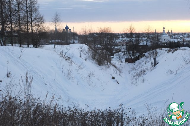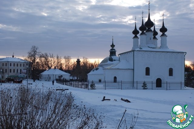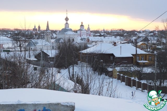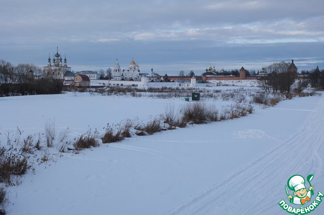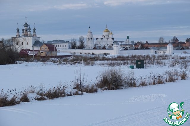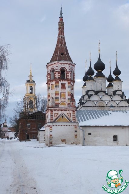 На переднем плане Покровский женский монастырь, с золотыми куполами Покровского собора. На заднем плане красные стены Спасо-Евфимиевского мужского монастыря, основанного в 1352 г.