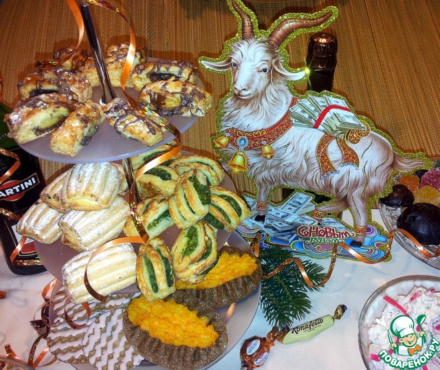 Что успела приготовить...Булочки ( со шпинатом, морковью для меня и козы. Я родилась в год козы ) и печенье приготовили заранее со ст. сыном. Пока я была на работе мл. сын всё сварил для салатов.