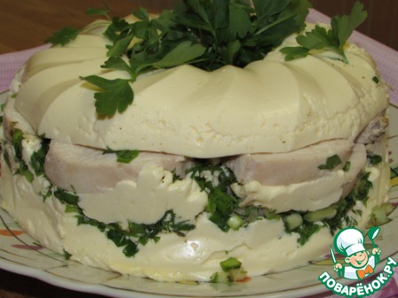 Таким способом готовить куриное филе мне ещё не приходилось, очень волновалась и переживала, получится или нет. У Нины красиво так оформлено блюдо, а я не дотянула до совершенства- желатин оказался ультрабыстрый, застыла майонезная заливка первый слой быстренько, а я ещё мясо нарезаю!!!!!