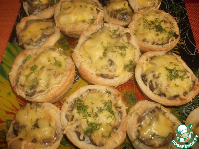 Очень вкусное, сытное блюдо. Делала без опят. Формочки были разных размеров, теперь подумываю приобрести металлические формочки, чтобы легче было в них раскладывать тесто. Всем советую приготовить.