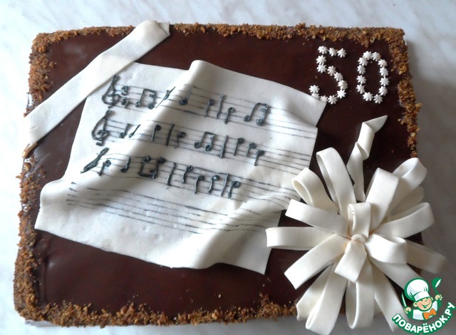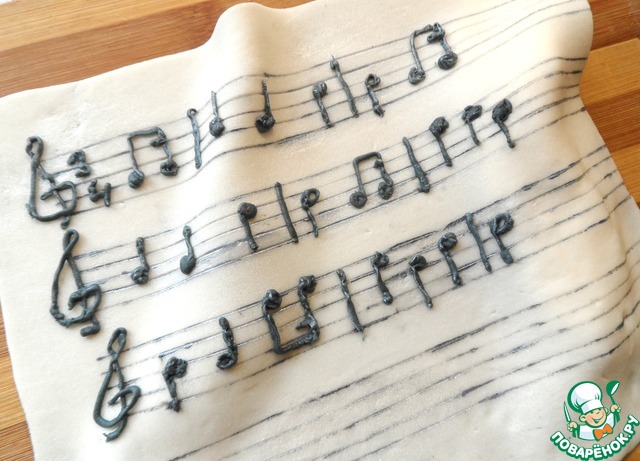 На нотном "листе," сделанном из мастики ноты песни Хепи бездей тую.Ноты " писала" мастикой, было очень даже не просто. Это уже позже я узнала, что проще было бы сделать это айсингом, который можно было даже самой приготовить. Но как говорят-на ошибках учатся. Эту идею я взяла у поваренка Евдокуша из её дневников, за это ей СПАСИБО!