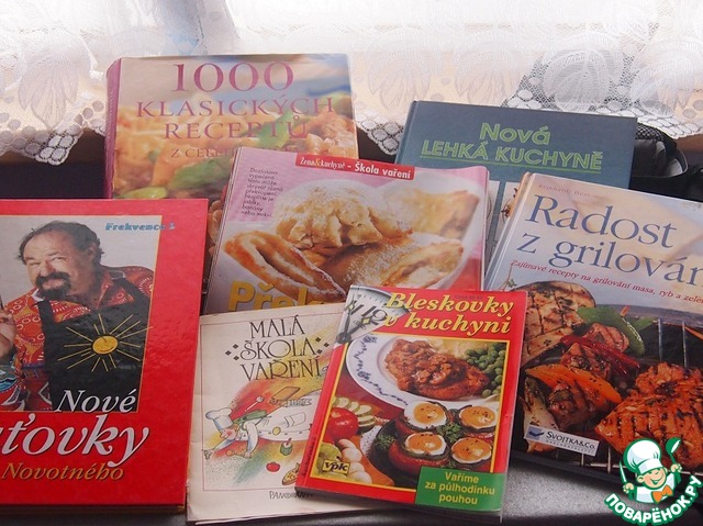 А вот моя полочка с книжками по кулинарии, рецепты с "Поваренка" в трех регистраторах - сладкая выпечка, несладкая выпечка и остальные рецепты.