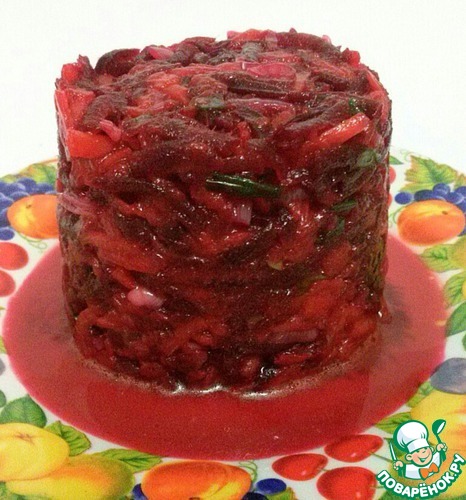 Не буду оригинальной в оценке этого рецепта. Очень понравилось. Приготовила немного, на 0,5кг, на ужин. Добавила и морковь. Увеличила кислоту лимоном, т.к. морковка была сладкой. Сыну понравилась подача, сам потянулся положить себе салат и с удовольствием съел. Вот только у меня натекло много сока. Как это исправить, кто подскажет? Просто слить после того, как снять кольцо, потеки останутся неэстетичные.