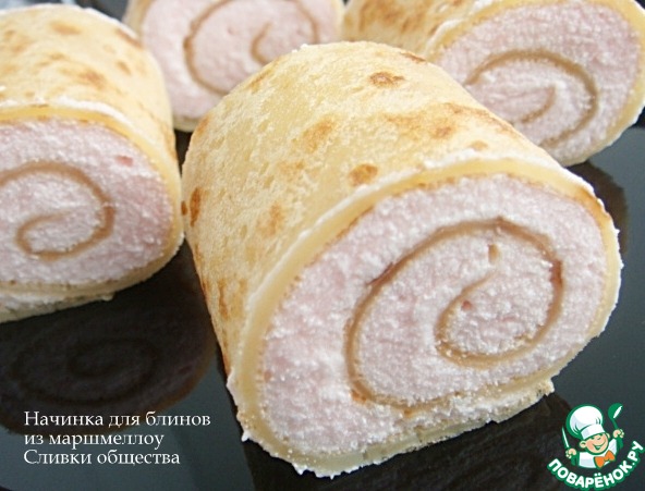 Начинка для блинов из маршмеллоу "Сливки общества" по рецепту Наташеньки Senpolia настолько нежная и воздушная,рулетики из блинов необыкновенно вкусные!